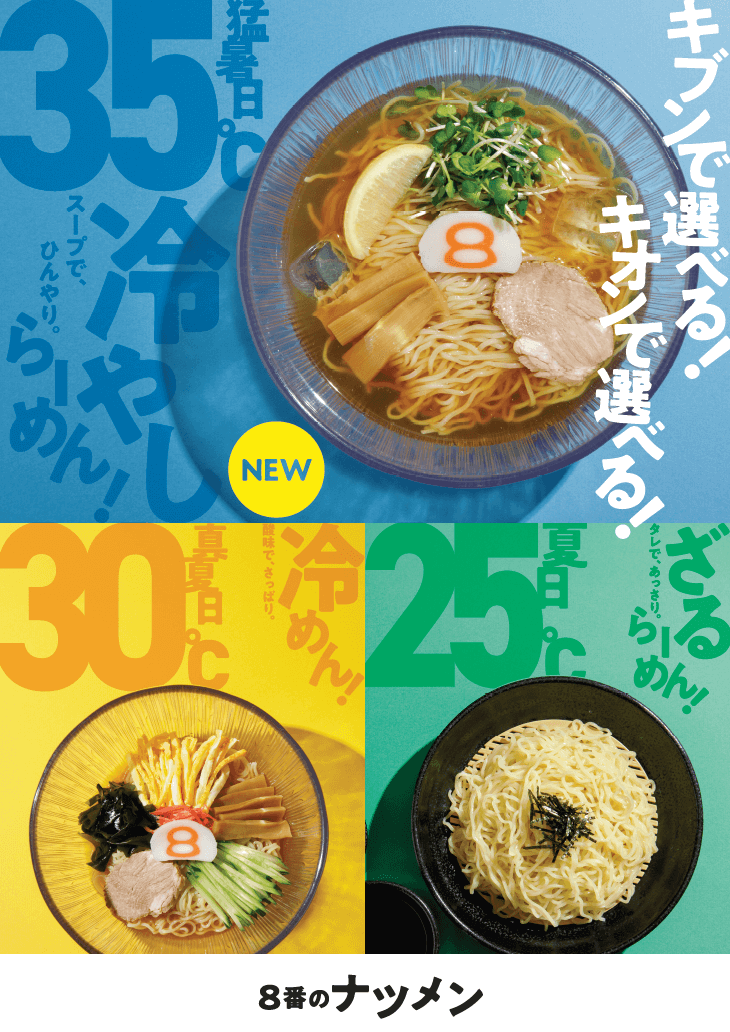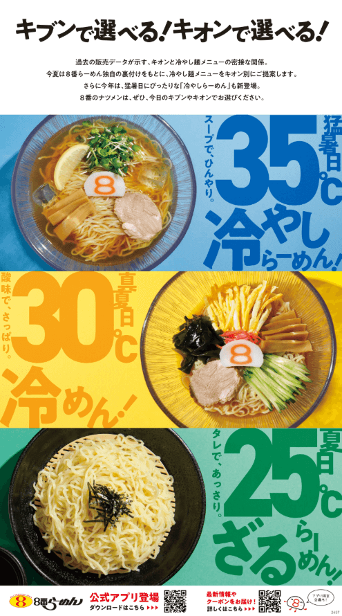 | 企画で注意した点、及び結果 | 注意した点 定番の「ざるらーめん」と「冷めん」に、新登場の「冷やしらーめん」が加わった8番の冷やし麺シリーズを「夏の定番・夏の風物詩」として定着させるために以下のことに注意しました。 ●独自性の高い表現 外食産業では様々な夏商品が登場することが予想されるため、埋もれないよう独自性の強い表現を意識することに注意し、3商品を括るネーミング開発~ツール制作・PRを実施しました。 ●顧客体験の最適化 「どのメニューを食べるか」を迷わせないよう、商品ごとの特徴を明確化。お客様がその日の状況に合わせて直感的に選べる環境を整えました。 結果 データに基づいた戦略的なプロモーションにより、高い成果を収めることができました。 ●既存メニューの販売増進: 「ざるらーめん」「冷めん」の販売数が前年実績を大きく更新。 ●新商品の目標達成: 新商品の「冷やしらーめん」も、当初の販売目標を無事達成しました。 ●全体売上の向上: 夏季全体の売上は前年比を大きく上回る結果となりました。 |